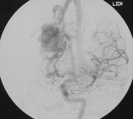 | In the angiogram above there is a vascular malformation in the right medial frontal lobe. There is contrast in the arterial branches of the left internal carotid, while there is continued venous drainage from the vascular malformation on the right. This vascular malformation was supplied by a pericallosal branch of the anterior cerebral artery. This patient had a history of severe headaches for years. Some patients may have seizures. In the axial MRA image below, the vascular malformation can be seen to drain into the superior sagittal sinus. |
