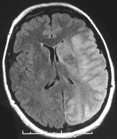 | The MRI scan in FLAIR mode above and enhanced below reveals an area of massive infarction of the left cerebral hemisphere, mostly in the right middle cerebral distribution, that is of recent formation, with brain swelling and a midline shift to the right compressing the ventricular system. |