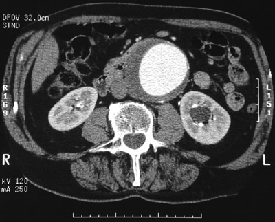 ![]() | This abdominal CT scan with contrast reveals an abdominal aortic aneurysm that extended from just below the renal arteries past the takeoff of the inferior mesenteric artery. Note the bright contrast material filling the lumen with surrounding mural thrombus that is darker. The total diameter is approximately 7 to 8 cm in diameter, in great danger of rupture. A pulsatile abdominal mass was palpable. |