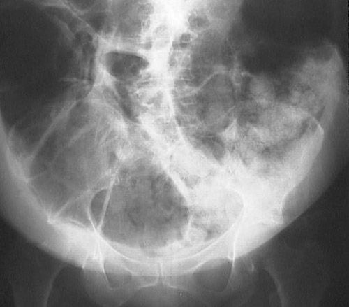 ![]() | This attempt at a barium enema has been foiled by a large fecal impaction in which there is a large amount of stool in the colon with irregular areas of opacification. Stool has a granular appearance because the stool is mixed with gas in the colon. Note that the abdomen is quite distended. |