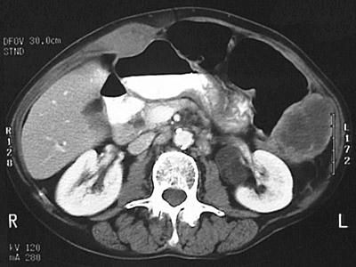 ![]() | This abdominal CT scan reveals metastases in the abdominal wall, the left pericolic gutter, the liver hilum adjacent to the gallbladder, and in the retroperitoneum next to the left kidney. The colon is dilated as a consequence of partial obstruction. |