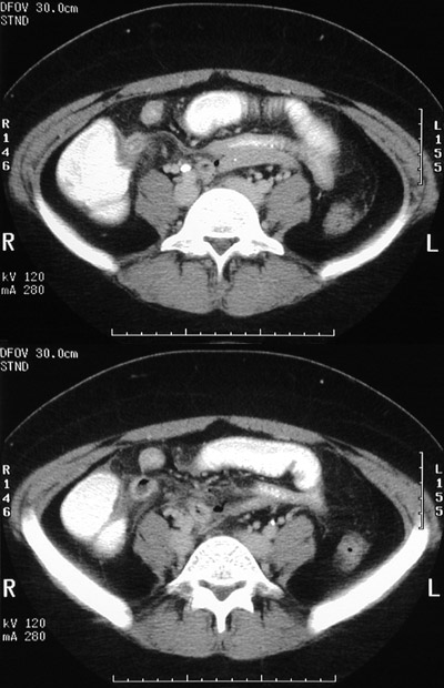 | Here is another example of acute appendicitis with dilation to 17 mm and wall thickening. This patient presented with a day-long history of lower abdominal pain. On physical examination, there was rebound tenderness in the right lower quadrant. The patient's WBC count was 13,900/microliter. |