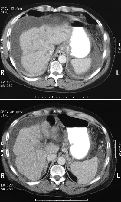 ![]() | In these two views from an abdominal CT scan are prominent dilated collateral vessels in the region of the gastroesophageal junction in a patient with a small, nodular shrunken liver with cirrhosis. Cirrhosis has led to portal hypertension and varices as well as to ascites with abdominal fluid collections. This patient had ulcerative colitis and developed primary sclerosing cholangitis. This patient is postoperative following colectomy. |