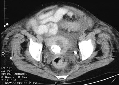 | There is a bright rounded mass in the uterus seen in this pelvic CT scan that represents a calcified leiomyoma. Leiomyomas tend to involute following menopause and become more fibrous, with some exhibiting dystrophic calcification. Note the small fluid collection in the endometrial cavity that occurs in some older women with cervical stenosis. |