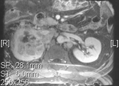 of the left kidney, seen with T1 weighting above and T2 weighting below.