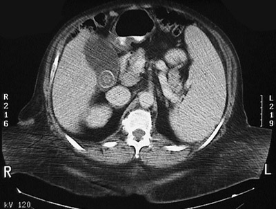 ![]() | This abdominal CT scan with contrast demonstrates a gallstone within a dilated gallbladder next to the liver on the patient's right. Gallstones may contain varying portions of cholesterol, calcium, and bilirubin. They are often built through apposition of layers, leading to the laminated appearance seen here. |