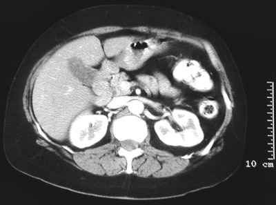 ![]() | In the abdominal CT scan view above, there is an irregular mass within the lower portion of the gallbladder, with the inferior tip of the right lobe of liver adjacent to it. This mass proved to be an adenocarcinoma of the gallbladder. In the frame below, the gallbladder can be seen next to the liver. The gallbladder wall is irregular, and there are also scattered densities within the lumen, representing gallstones (up to 90% of gallbladder adenocarcinomas arise in association with gallstones). |