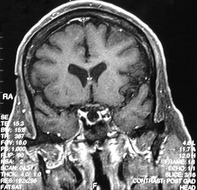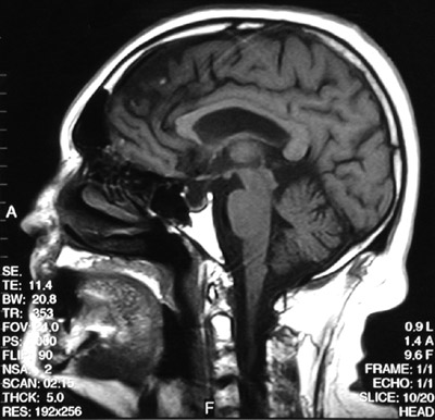 | The T1 weighted MRI scan in sagittal view above demonstrates an empty sella turcica. A T1 weighted post gadolinium coronal view is seen below. Some cases of empty sella syndrome may result from a herniation of the arachnoid through the diaphragma sella to cause pressure atrophy of the pituitary. |