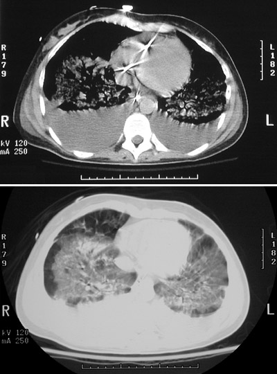 | Here is a chest CT scan of a patient with multiple organ failure syndrome in the intensive care unit. One component of this syndrome is pulmonary diffuse alveolar damage with opacifications in all lung fields, seen best in the soft tissue window setting in the lower panel. The upper panel in lung window setting reveals the opacifications as well as prominent posterior effusions. (A Swan Ganz catheter traversing the right heart is scattering the x-rays to produce the star-shaped areas of brightness in the upper panel.) |