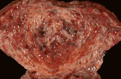 This bladder at autopsy has been opened to reveal areas of hyperemia of the mucosa. This is acute cystitis. The characteristic urinalysis findings for acute cystitis are shown below. |
