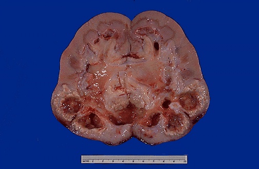 ![]() | There was a large renal calculus (stone) that obstructed the calyces of the lower pole of this kidney, leading to a focal hydronephrosis (dilation of the collecting system). The stasis from the obstruction and dilation led to infection. The infection with inflammation is characterized by the pale yellowish-tan areas next to the dilated calyces with hyperemic mucosal surfaces. The upper pole is normal and shows good corticomedullary demarcations. |