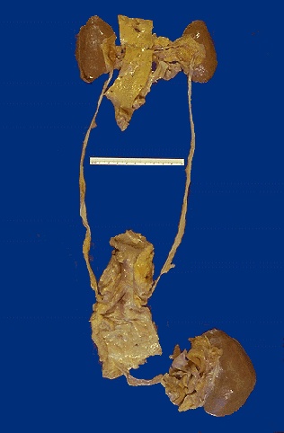 | The end result of many renal diseases -- whether they are renal vascular diseases, glomerulonephritis, or chronic pyelonephritis--is end stage renal disease (ESRD). In ESRD, the kidneys are small bilaterally, as shown here. This condition is associated with chronic renal failure, and the patient's blood urea nitrogen (BUN) and serum creatinine continue to increase. Chronic renal failure can be treated by dialysis or by kidney transplantation, as shown here. |