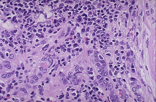 | Both lymphocytes and plasma cells are seen in this case of chronic pyelonephritis. It is not uncommon to see lymphocytes accompany just about any chronic renal disease: glomerulonephritis, nephrosclerosis, pyelonephritis. However, the plasma cells are most characteristic for chronic pyelonephritis. |