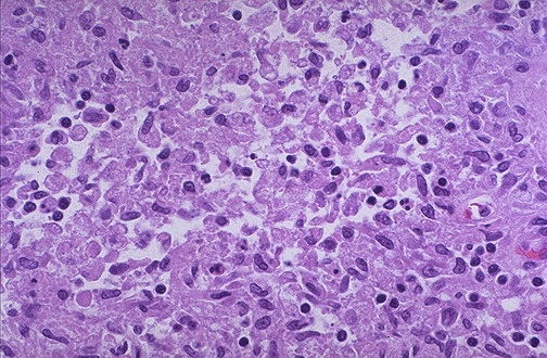 The microscopic appearance of xanthogranulomatous pyelonephritis shows many pale to foamy macrophages from breakdown of renal parenchyma with ongoing inflammation.