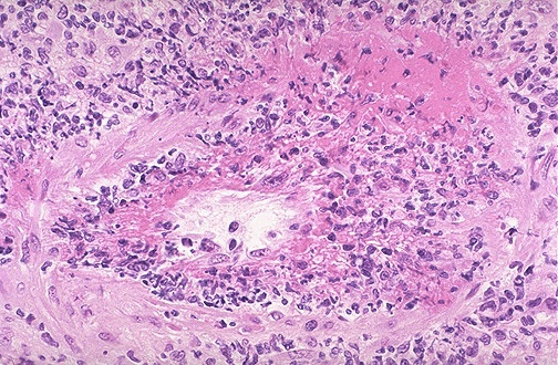 | At high power, the vasculitis is seen to involve a renal artery branch. This is a necrotizing granulomatous vasculitis. In this case, the anti-neutrophil cytoplasmic autoantibody (ANCA) serology was positive and a diagnosis of Wegener granulomatosis was made. This patient also had pulmonary involvement with this disease. |