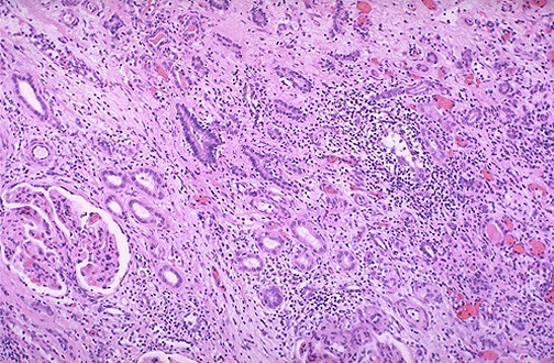| Seen here is acute tubulointerstitial cellular rejection of a renal transplant. This can occur days to months to years following transplantation. Both CD4 and CD8 lymphocytes participate in this rejection reaction. The immunosuppressive drugs such as cyclosporine given to counteract the rejection may lead to nephrotoxicity with similar changes as well. |