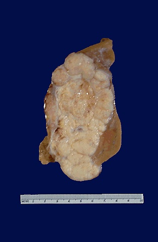 | This small kidney from a 4 year old child contains a lobulated tan-white mass. This is Wilms tumor of the kidney. Many are now known to be associated with genetic defects on chromosome 11. The children with Wilms tumor usually present with abdominal enlargement from the mass effect. Nowadays, treatment gives a better than 90% 5 year survival. |