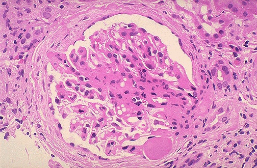 | This is focal segmental glomerulosclerosis (FSGS). An area of collagenous sclerosis runs across the middle of this glomerulus. In contrast to minimal change disease, patients with FSGS are more likely to have non-selective proteinuria, hematuria, progression to chronic renal failure, and poor response to corticosteroid therapy. |