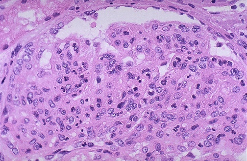 | The hypercellularity of post-infectious glomerulonephritis is due to increased numbers of epithelial, endothelial, and mesangial cells as well as neutrophils in and around the glomerular capillary loops. This disease may follow several weeks after infection with certain strains of group A beta hemolytic streptococci. Patients who have had a strep infection typically have an elevated anti-streptolysin O (ASO) titer. |