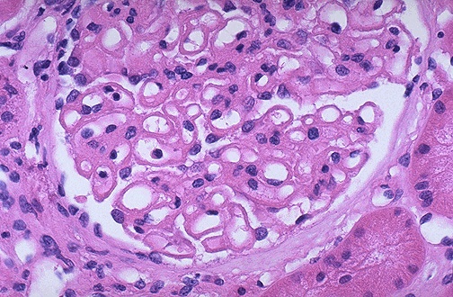 Here is the light microscopic appearance of membranous glomerulonephritis in which the capillary loops are thickened and prominent, but the cellularity is not increased. Membranous GN is the most common cause for nephrotic syndrome in adults. Some cases of membranous GN can be linked to a chronic infectious disease such as hepatitis B, a carcinoma, or SLE, but many cases are idiopathic. Characteristic urinalysis findings are shown below. |