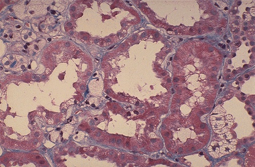 | This is a type of hereditary nephritis known as Alport syndrome in which patients may also manifest nerve deafness and eye problems. The renal tubular cells appear foamy because of the accumulation of neutral fats and mucopolysaccharides. The glomeruli show irregular thickening and splitting of basement membranes. |