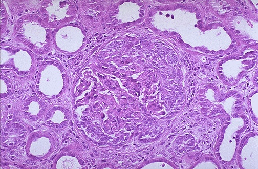 | Here is another glomerulus with epithelial crescents squashing the glomerular tufts from all sides. RPGN may be idiopathic or may result from SLE, post-infectious GN (as in some cases of post-infectious GN), from various types of vasculitis, and from Goodpasture syndrome. |