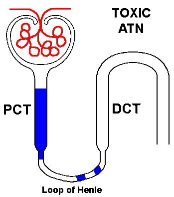 These diagrams illustrate acute tubular necrosis. The distribution of the areas of necrosis is more segmental with ischemic injuries, while toxic injuries result in more diffuse proximal tubular injury.