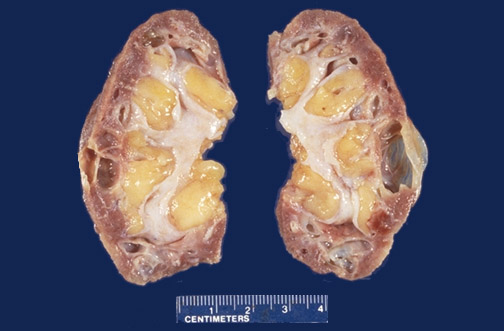 | And finally, if all else fails, call it "chronic glomerulonephritis". Seen here are atrophic kidneys with a thin cortex from a patient at autopsy with chronic renal failure (CRF). About a third to half of patients with CRF slowly reach end stage without significant signs or symptoms along the way, and at the end stage renal disease (ESRD) there are no diagnostic features and, therefore, no point in performing a renal biopsy. A steadily rising serum creatinine and urea nitrogen are clues. Most patients will also be hypertensive. (Some simple cysts are also seen here.) |