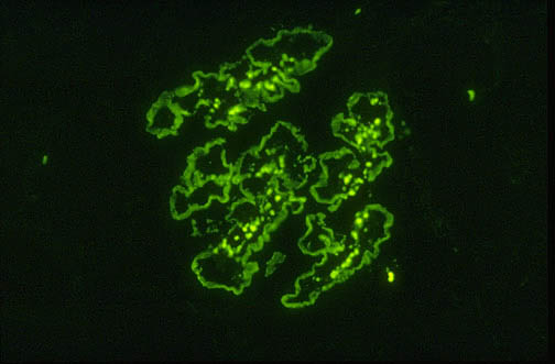 | The bright deposits scattered along capillary walls and in the mesangium by immunofluorescence microscopy with antibody to complement component C3 are typical for membranoproliferative glomerulonephritis, type II. MPGN type II, known as dense deposit disease, produces a nephritic syndrome. Most patients have detectable circulating C3 nephritic factor, an IgG autoantibody. |