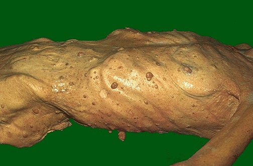 | This is neurofibromatosis, an autosomal dominant condition in which there is formation of neurofibromas throughout the body, but most often on the skin as seen here with neurofibromatosis type 1 (NF-1). NF-1 accounts for 90% of neurofibromatosis cases and is also known as vonRecklinghausen disease. |