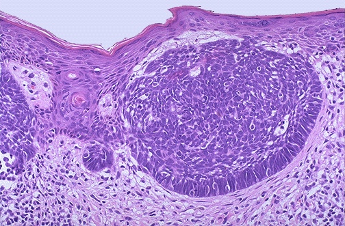 | Nests of basaloid cells are dropping off into the upper dermis in this example of a basal cell carcinoma of the skin. These neoplasms can be multifocal. They are slow growing but relentless. The problems they cause are related to local invasion. Metastases are quite rare. |
