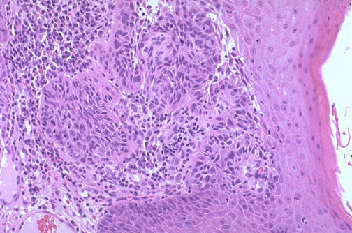| A squamous cell carcinoma is seen here at medium power. The neoplastic cells extend downward into the dermis. Note the pleomorphism of the cells, and there is little keratinization. Compare with the normal skin at the right. An intense inflammatory infiltrate is present. |