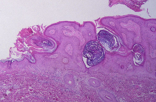 | Note how this seborrheic keratosis is formed of benign appearing squamous epithelium and how the lesion extends above the level of the surrounding epidermis seen at the left, giving it the raised appearance as though it were "stuck on" to the skin surface. |
