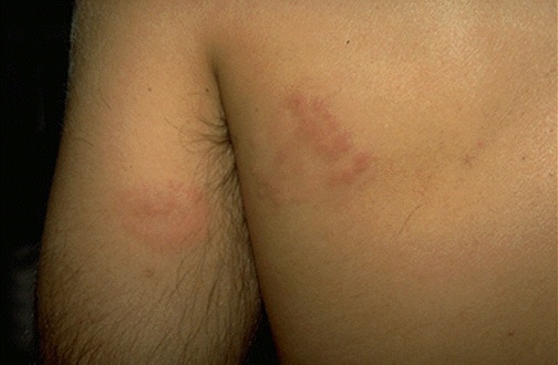 | This is contact dermatitis, a form of type IV hypersensitivity reaction that is localized. This person contacted a plant in a tropical jungle to which he was already sensitized. A couple of days later, the skin is red from inflammation and slightly raised from local edema. |