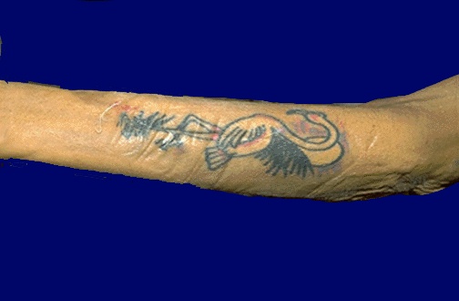 | Here is a tattoo. Tattooing is a practice that is thousands of years old. In many cultures, tattoos have great significance. The pigment in tattoos is transferred to the dermis with a needle, so there can be a risk for infection. The tattoo itself over time tends to lose sharpness and intensity of color. |