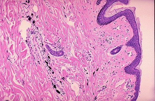 | This is the microscopic appearance of tattoo pigment (black) in the dermis. Note that this pigment is well within the dermis and, therefore, difficult to remove. Therefore, removing or changing a tattoo is difficult. Cosmetic surgery is not covered by insurance, either. |
