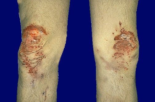 | Here are lacerations and abrasions about the knee suffered in an auto accident. While abrasions represent a scraping of the skin surface so that the epidermis is focally lost, lacerations represent forceful irregular tearing of the skin extending into the underlying soft tissue. |