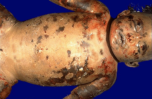 | This is an extensive burn injury in a small child. The extent of a burn injury is assessed by estimating the total body surface area (TBSA) involved with the burn, as well as what % is total thickness and what % is partial thickness burn. This injury shown here involved >90% TBSA. The prognosis depends upon the TBSA, the age of the patient, underlying disease states, and presence of an inhalation injury. Skin grafting from non-burned sites is necessary if the full thickness of the skin is burned. |