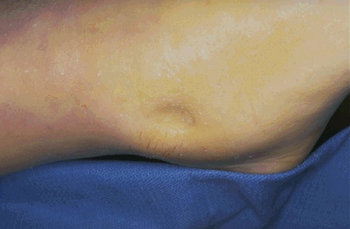 | If there is generalized fluid collection in soft tissues, then one can demonstrate "pitting edema" as shown here in the center where an impression is left by your examining finger with pressure over the area of edema. Pitting edema can be judged as 1+ to 4+ depending upon the amount of fluid. Such edema is seen in dependent body areas such as the lower legs in persons with poor cardiac function. |
