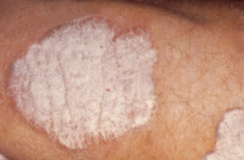 | This is psoriasis. The thick, silvery, scaling lesions are most often found over bony prominences, scalp, genitalia, and hands. It occurs when there is abnormal proliferation and turnover of epidermis (reduced from a month to only 4 days for a cell to transit from basal layer to surface). |