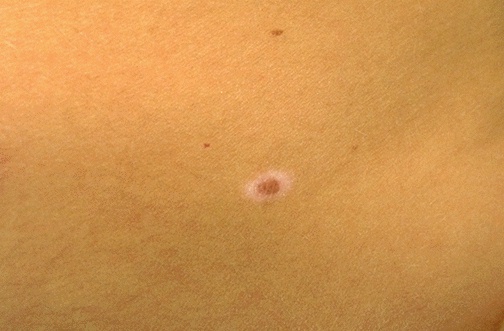 | This is a halo nevus, so called because the central pigmented area is surrounded by a lighter zone. Nevi can show considerable variation in their gross appearances: flat to raised, pale to darkly pigmented. However, most are small, well-circumscribed lesions that hardly seem to change at all, or change very slowly over time. |