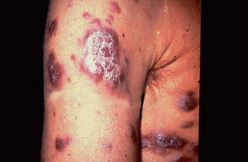 | This is Kaposi's sarcoma (KS). There were forms of KS seen before the AIDS epidemic, but they were uncommon. KS with AIDS is usually seen in homosexual males and is rare in other risk groups. The lesions can start as small reddish to red-purple plaques or patches. Over time, the lesions become nodular and larger and more numerous. If the HIV test is positive, then KS is diagnostic of AIDS. |