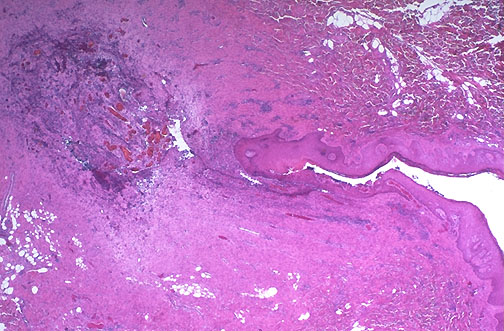 | Here is a pilonidal sinus and tract extending to skin surface at the right. A pilonidal sinus appears as a small opening, sometimes with protruding hair, in the intergluteal fold several centimeters posterior to the anus. These lesions are most common in young caucasian males. |