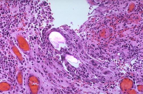 | At high magnification under polarized light, two bright polarizing hair shafts are seen in the center of this pilonidal sinus, surrounded by inflammation with foreign body giant cells. A pilonidal sinus probably arises when hair penetrates an area of inflammation and comes to rest in the dermis, where a foreign body reaction is elicited. A painful mass can result. |