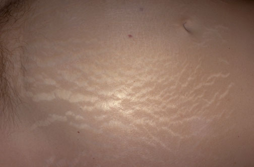 | The pale linear depressed white scar-like marks seen here on the lower abdomen are striae (more formally called striae atrophicae). They can be pink to purple when they first appear. These striae can arise on the abdomen, breasts, buttocks, and thighs in association with weakening of the dermal elastic tissue. Predisposing conditions include: pregnancy, obesity, and Cushing syndrome. |