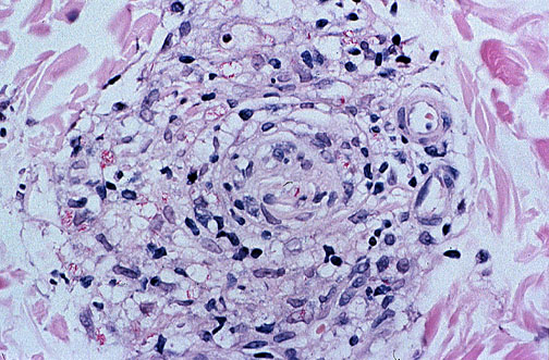 | Fite's modification of the acid fast stain reveals single thin short red rods of M. leprae, as well as some clusters of organisms in macrophages. In the tuberculoid form, acid fast organisms are hard to find, but in the lepromatous form, there are macrophages filled with numerous acid fast bacilli ("globi"). Seen here is the "borderline" form with some organisms and some epithelioid cells. It is now possible to control leprosy with drug therapy (rifampin as a first-line drug and dapsone second). |