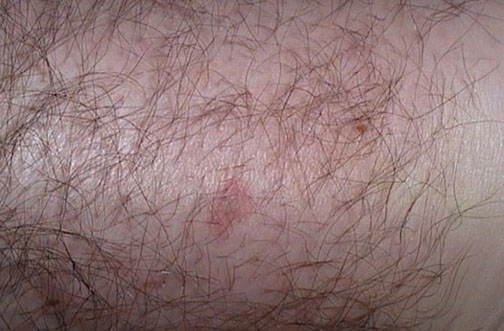 | The erythematous area seen here resulted from a bee sting. There is a pale center to the bite, representing an acute necrotic response, and the surrounding skin is edematous and mildly erythematous from the acute inflammation. In a small percentage of persons, such stings may elicit an anaphylactic reaction (type 1 hypersensitivity). |