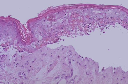 | There are few dermatologic emergencies. This is one of them known as toxic epidermal necrolysis, or TEN. Seen here is a necrotic epidermis lifting off the dermis to form a subepidermal bulla. There are several variations on this theme, which may be the result of a reaction inducing keratinocyte apoptosis as a consequence of an infection or use of a drug: |