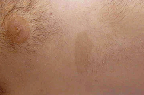 | This flat, pale brown macule on the skin of the chest is a cafe-au-lait spot. When there are six or more of these spots that are 1.5 cm or larger, then it is likely that the patient has neurofibromatosis. Cafe-au-lait spots are often located over peripheral nerve trunks and are seen in over 90% of persons with neurofibromatosis. |