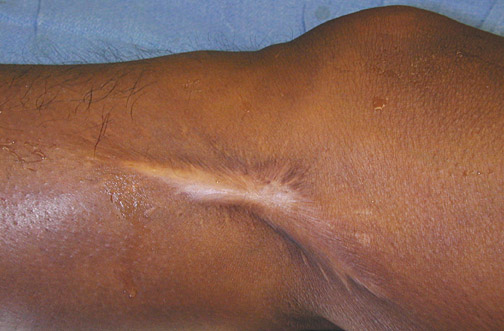 | For comparison, a large scar is seen here below the medial aspect of the right knee. The original large laceration was not closed with sutures and "granulated in" by "second intention" to form this large, irregular, dense white scar. However, it is not nodular. |
